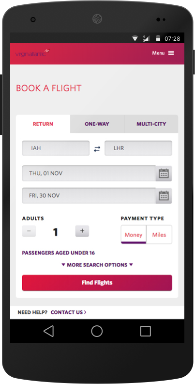 With the new brand-identity systems and components system in place, we designed the other screens of the Virgin Atlantic Mobile App.