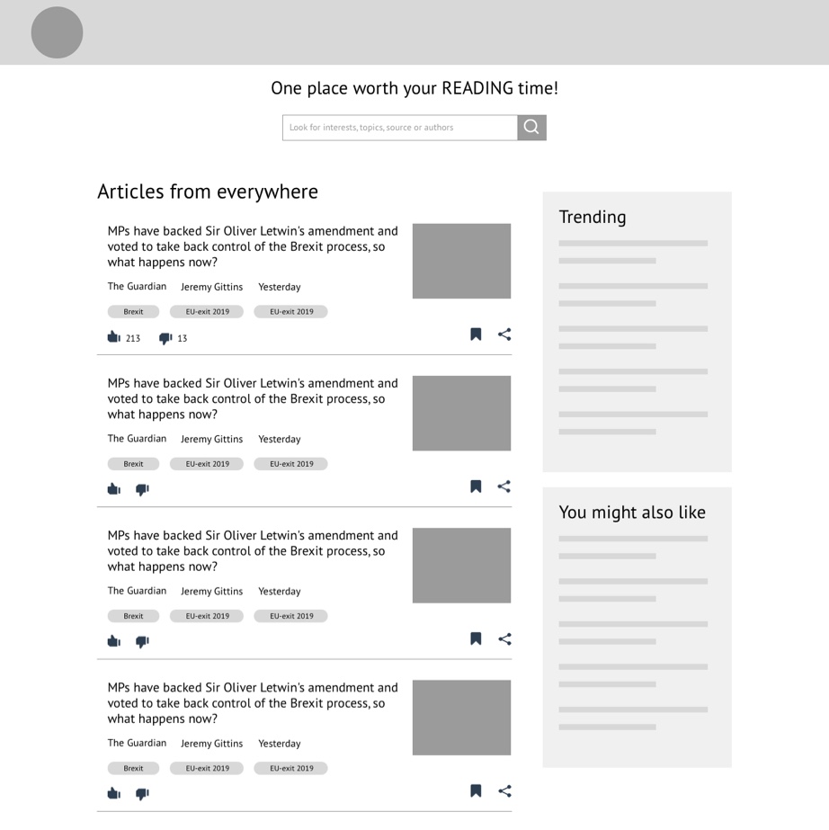 Users can search content, read articles or look at what's trending on their landing page. Signed in users can 'like', 'dislike', 'share' or 'save' an article.